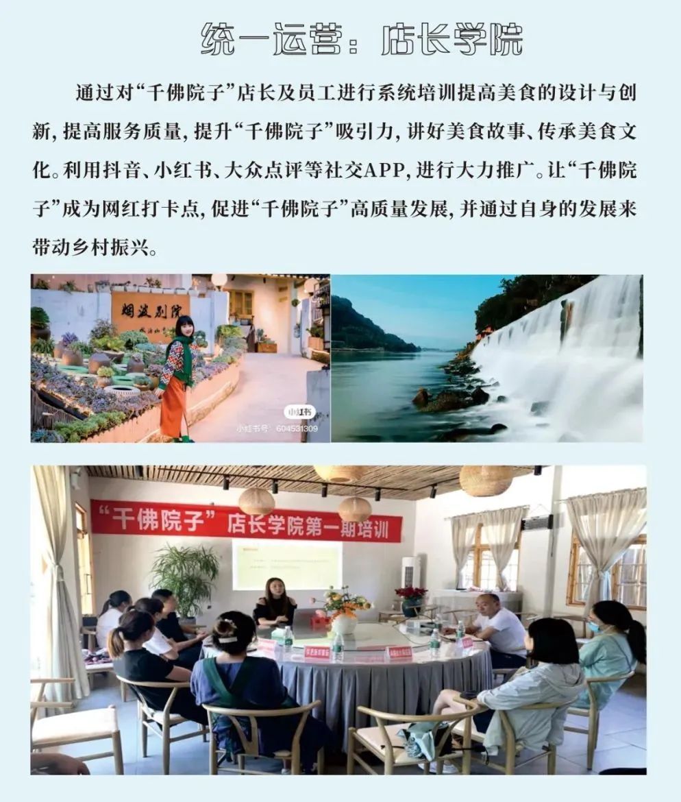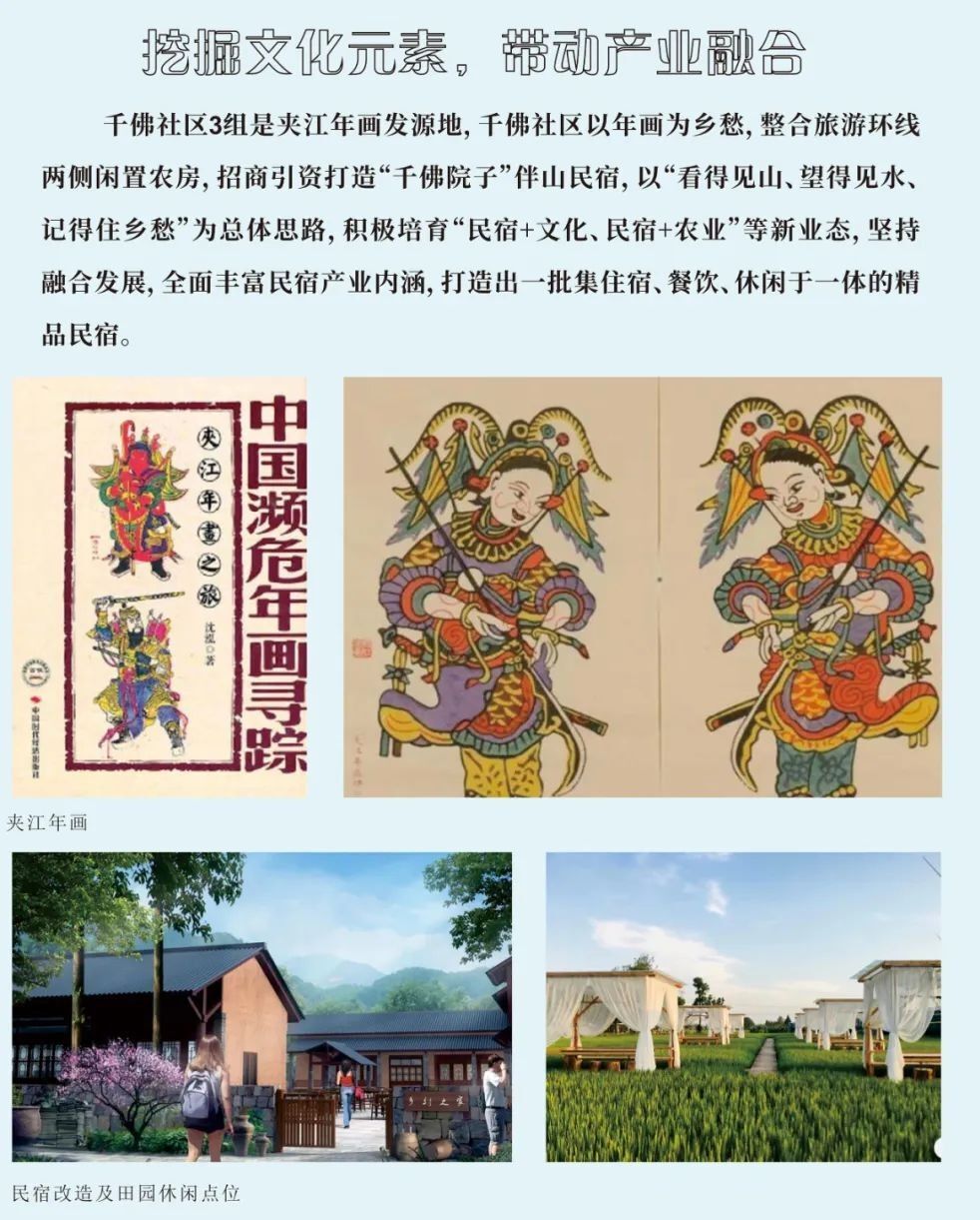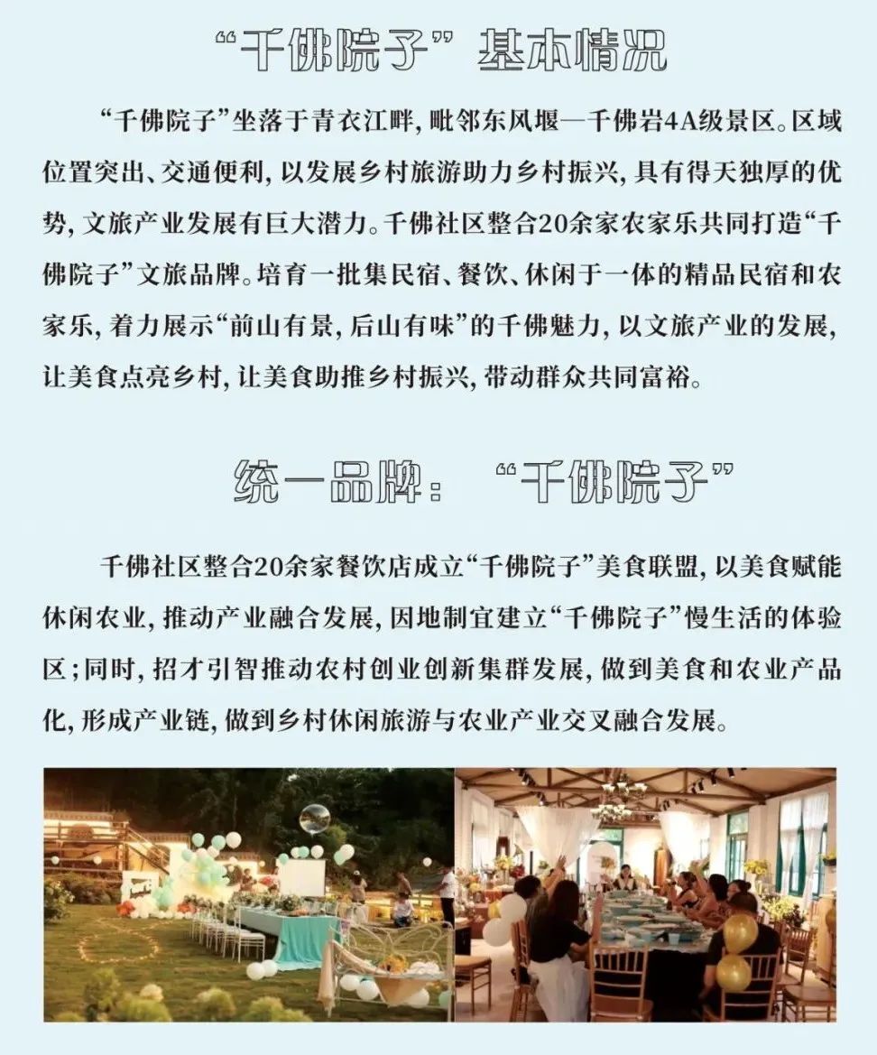 干佛社区整合20余家农家乐共同打造”干佛院子”文旅品牌。培育一批集民宿、 餐饮、休闲于一体的精品民宿和农家乐,着力展示”前山有景, 后山有味”的干佛魅力。通过发展“茶叶香” 、“李子红”、 “枇杷甜”三大特色农产品,挖掘文化元素,引进特色项目,打造文旅青衣。