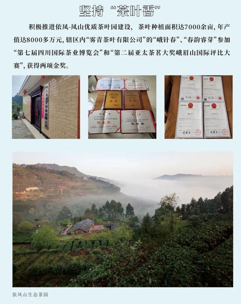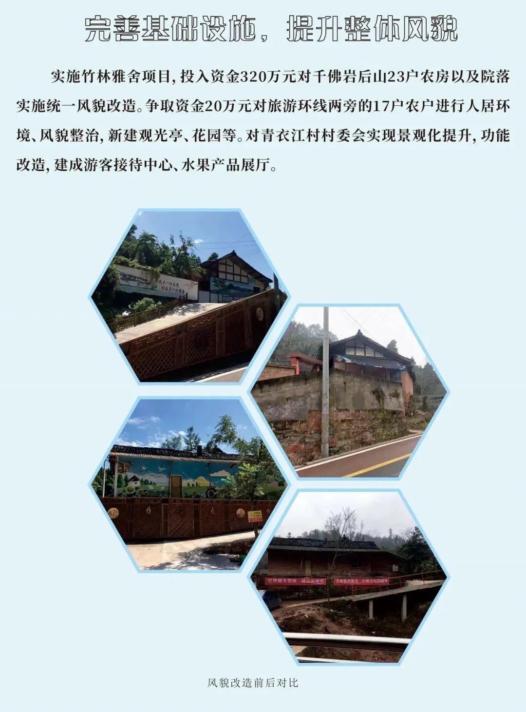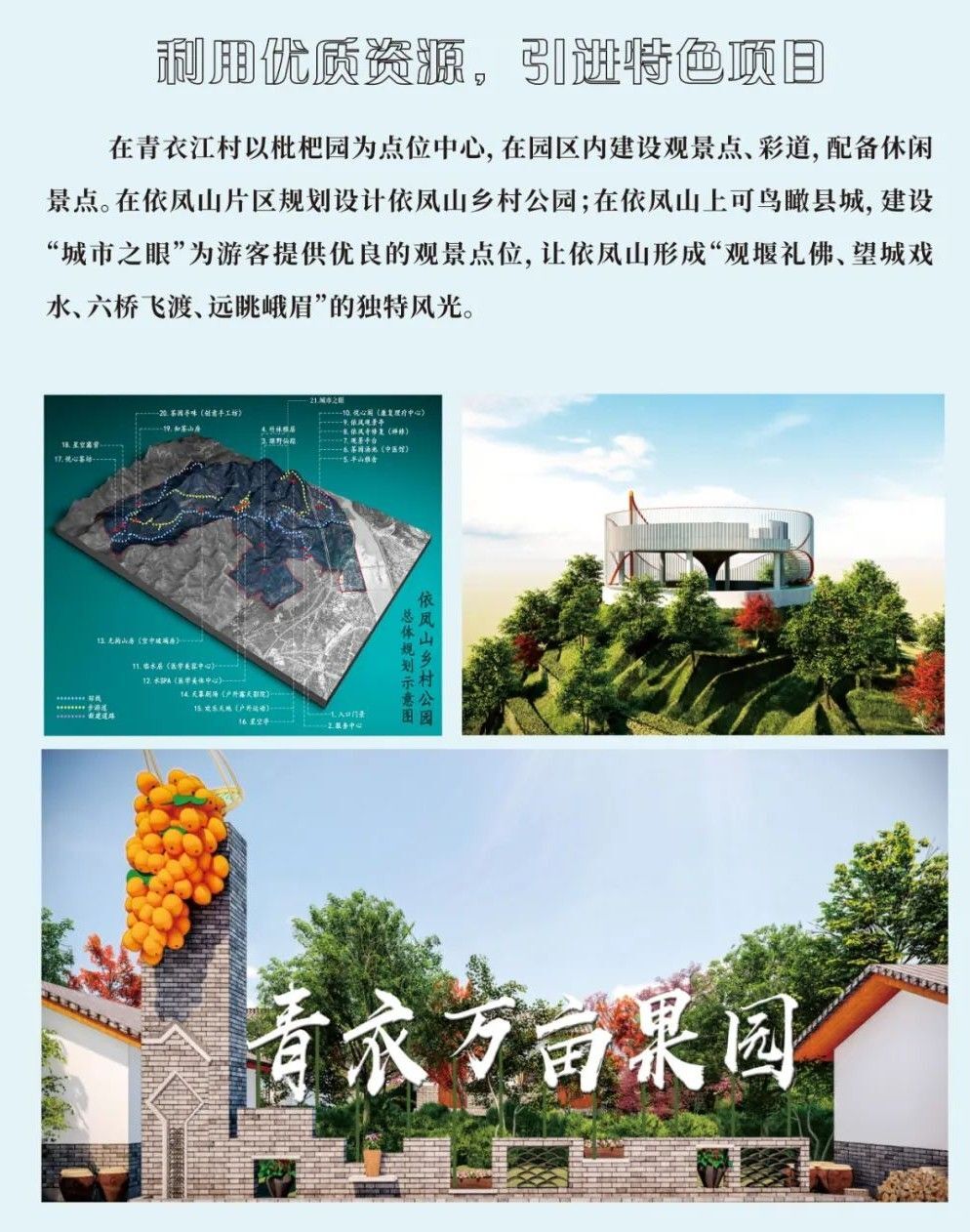 干佛社区整合20余家农家乐共同打造”干佛院子”文旅品牌。培育一批集民宿、 餐饮、休闲于一体的精品民宿和农家乐,着力展示”前山有景, 后山有味”的干佛魅力。通过发展“茶叶香” 、“李子红”、 “枇杷甜”三大特色农产品,挖掘文化元素,引进特色项目,打造文旅青衣。